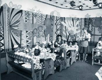 Επιπλέον, η διαρρύθμιση των κτιρίων υπηρετούσε τη βασική αρχή του σοσιαλιστικού κράτους, ότι είναι ευθύνη της κοινωνίας, με συλλογικό και οργανωμένο τρόπο, να αναλάβει να απαλλάξει το ατομικό νοικοκυριό από τον καταναγκασμό της καθημερινότητας. Δηλαδή, αυτό που είναι κυρίαρχο στον καπιταλισμό, η κάθε οικογένεια να έχει στην ευθύνη της τη σίτιση, την υγεία, τη φροντίδα των παιδιών, αυτό μετακυλίεται στην ευθύνη του σοσιαλιστικού κράτους, που αξιοποιεί όλα τα διαθέσιμα τεχνολογικά και επιστημονικά μέσα ώστε όχι μόνο να παρέχεται αυτή η φροντίδα, αλλά να είναι και αναβαθμισμένη. Ετσι, συνήθως τα κτίρια του παιδικού σταθμού αποτελούνταν από δύο ορόφους, με κεντρική θέρμανση. Στο 2ο όροφο ήταν το γραφείο του διευθυντή με τις ομάδες των μεγαλύτερων παιδιών προσχολικής ηλικίας και η αίθουσα εκδηλώσεων, για τις γιορτές, τη μουσική και τη γυμναστική. Στον 1ο όροφο βρίσκονταν η κουζίνα, το σιδερωτήριο, το πλυντήριο, η βιβλιοθήκη και οι ομάδες των μικρότερων παιδιών.