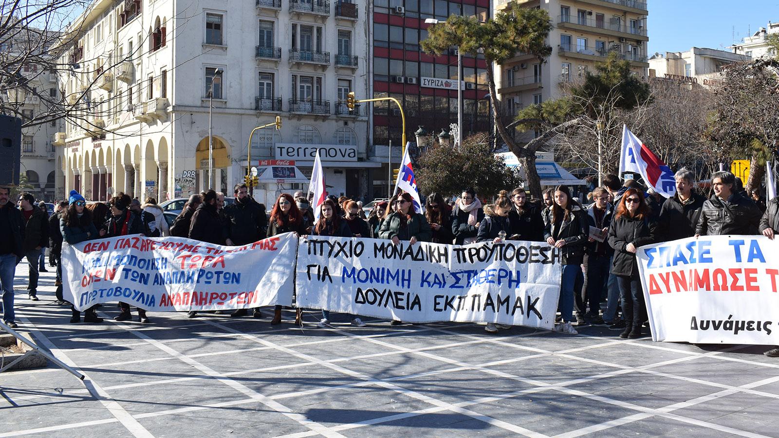 Στη Θεσσαλονίκη, οι εκπαιδευτικοί και εργαζόμενοι από άλλους χώρους του δημοσίου (υγεία, Δήμους, Πανεπιστήμια, κλπ) πραγματοποίησαν μαχητική συγκέντρωση και πορεία στους δρόμους της πόλης η οποία κατέληξε στο Υπουργείο Μακεδονίας Θράκης. Απαίτησαν να αποσυρθεί το νομοσχέδιο λαιμητόμος που πετά στην ανεργία χιλιάδες συμβασιούχους, μονιμοποίηση όλων των συμβασιούχων, μαζικούς διορισμούς για την κάλυψη των αναγκών στην παιδεία, κατάργηση των ελαστικών σχέσεων εργασίας, μόνιμη και σταθερή δουλειά για όλους.